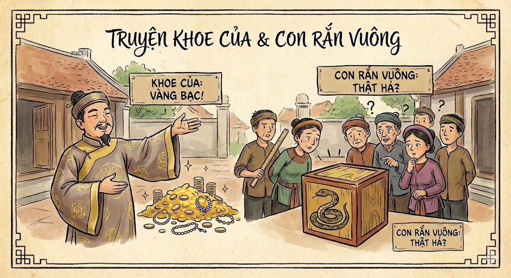 Hai truyện cười “Khoe của” và “Con rắn vuông” đều đem đến những bài học sâu sắc về cách sống. Trong truyện “Khoe của”, một người nghèo nhưng lại thích phô trương, luôn khoác lác về tài sản của mình dù thực tế chẳng có gì đáng giá. Sự giả tạo ấy nhanh chóng bị mọi người phát hiện và chê cười.