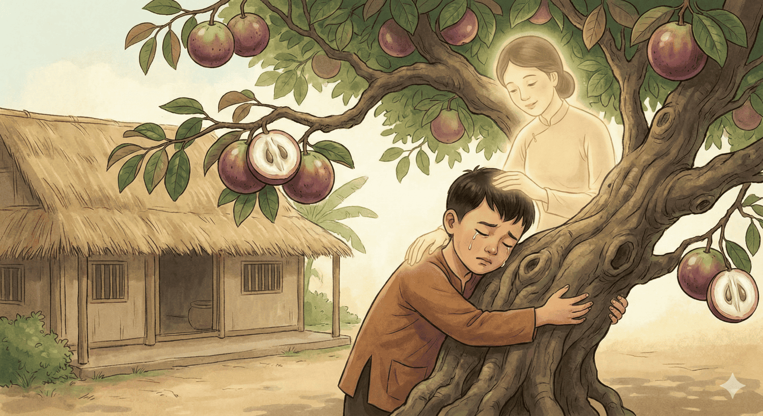 Một cậu bé ham chơi, không nghe lời mẹ, bỏ nhà ra đi. Người mẹ ngày ngày mong ngóng con, kiệt sức vì nhớ thương. Khi cậu bé hối hận trở về thì người mẹ đã biến mất, chỉ còn lại một cây lạ trong vườn. Cây cho quả tròn, vỏ xanh, khi bóp nhẹ sẽ chảy ra dòng nhựa trắng ngọt lành, giống như dòng sữa mẹ. Cậu bé ôm cây khóc, và từ đó người ta gọi cây ấy là cây vú sữa, tượng trưng cho tình mẫu tử thiêng liêng.
